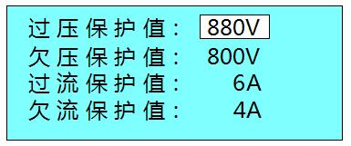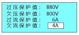 設(shè)置方法,在光標(biāo)位置通過數(shù)字鍵輸入,按一下確定鍵,同時進入欠壓保護值設(shè)定,再輸入所需電壓保護值數(shù)值,按一下確認鍵,再就進入欠流保護狀態(tài)進行欠流保護功能,若無需設(shè)定欠流保護值,按一下菜單鍵,進入下一個功能設(shè)置.